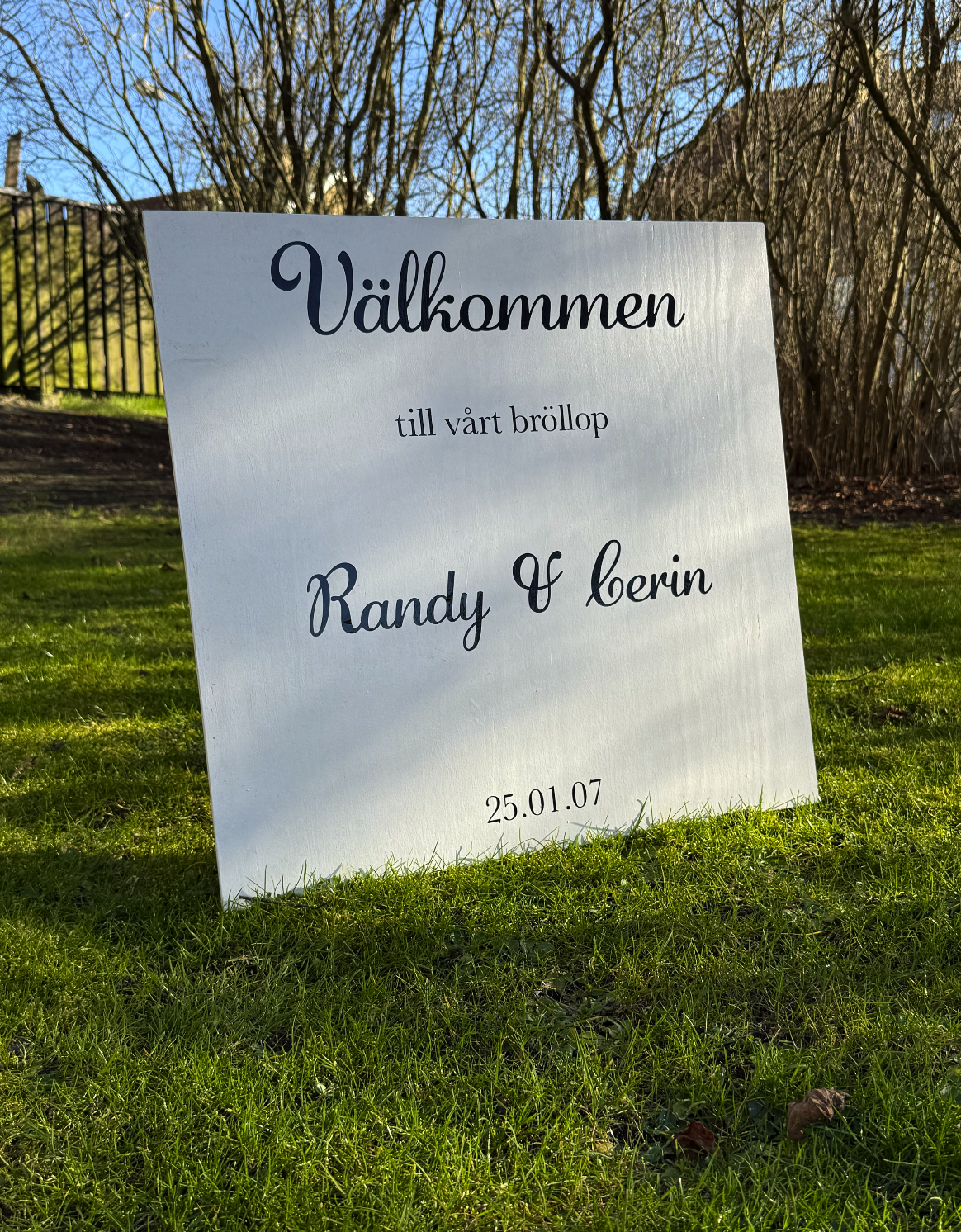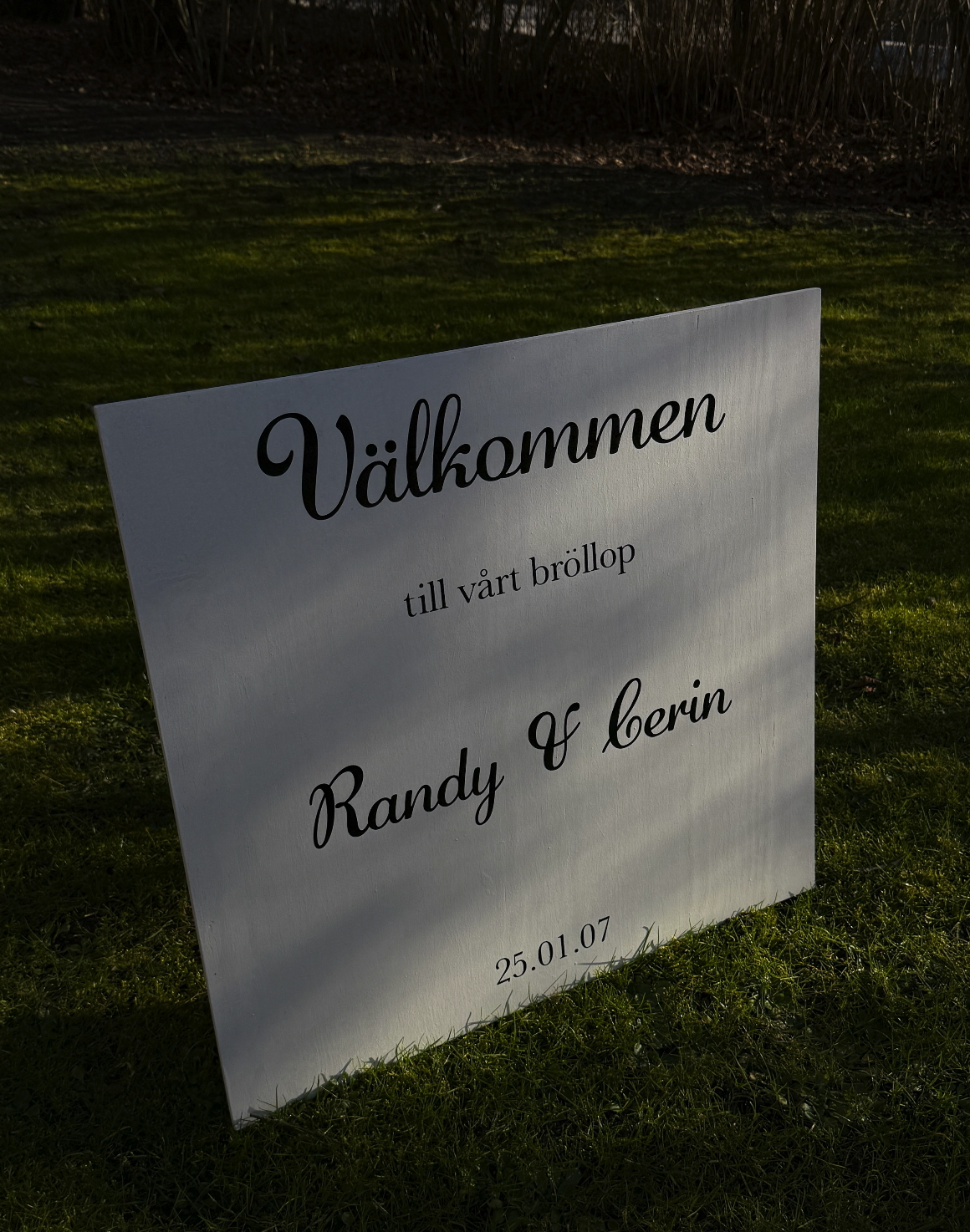 Gör skylten till din egen – välj färg och text, så skapar vi en personlig detalj för din stora dag!
